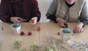 定番は、ドライフラワーを使ったワークショップ。昨日はドライフラワー・アレンジメントでした。マスク着用で、並んで作業する形です。使用するもの、触るであろう所は全て除菌シートとスプレーで感染予防に気を付けております。