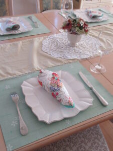 テーブルに飾っても食卓を明るくしてくれることでしょう。簡単にではございますが、実際にちょっと飾ってみました。一足先に春がきたようなテーブルコディネートになりますね。ティータイムの時間がきたようです。