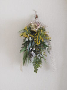 リースとスワッグで悩んだ末のスワッグです。ミモザの作品を作りたいとのご希望でしたから、まずはミモザで気を付ける事をお話しました。花粉が落ちますし、アレルギーのある方(ご自宅に招かれるお客様等にも)はご注意くださいと。またドライフラワーになりますから、葉の崩れやすさも予めお話させていただきます。