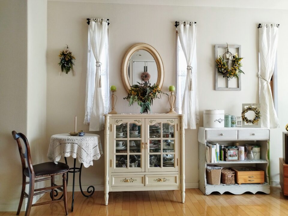 Yさんは、西の出窓に明るい色合いが欲しいからとご希望されていました。白い枠飾りは、壁がなくとも窓辺や棚の上などに置いて楽しむことが出来ます。また移動も簡単ですね。