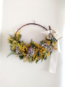 ドライになっているミモザは触るたびに、ボロボロと落ち、残ったミモザは3分の2くらいかもしれません。そこで、また大きめのミモザを二本加えました。つぶつぶこつぶなミモザのドライフラワーリース♪ バスケットに草花を摘んだみたいなリースが出来上がりました。いかがでしょう。
