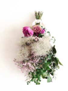 土台はユーカリで始めましょう。ここで気を付けたいことは、エアリーであること。きちきちにしないことが大事です。そうすことでボリュームが出ますし、この後重ねていきます草花が活きてまいります。土台が出来た段階で、一度輪ゴムで留めましょう。
