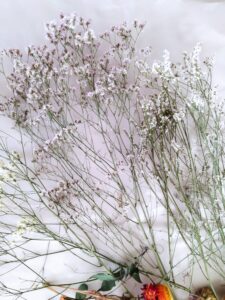 次にリモニュームやスターチスなどの小花を重ねます。土台の緑に小花が重なり、自然な野の風景が垣間見られましたでしょうか。この上にもう一度、緑を置き、スモークツリーやポイントフラワーを重ねてまいります。