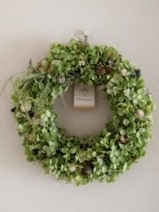 2022年のアナベルリースが出来上がりました。グリーンから白色、そしてまたグリーンに変わるアナベル。最近はライム色のアナベルとしてドライフラワーリースでも定番の花材になっております。