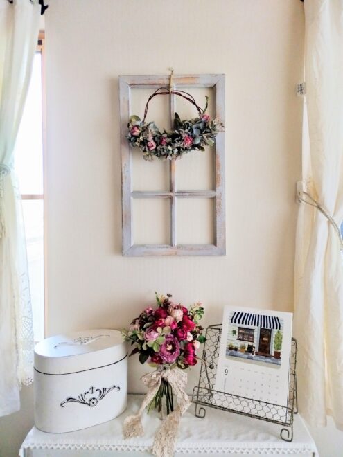 我が家は、築17年のなかなか年季の入った戸建てです。レッスンはリビングダイニングルームで、ダイニングテーブルでのレッスンです。生活感満載で申し訳ないことですが、みなさんのお家に飾るイメージもしやすいでしょう、と言うことにさせて頂いております。