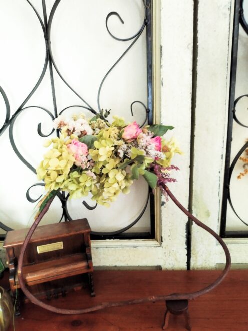 これは私のミスだと反省しております。それでも全体のバランスからいいますと、やはりこの巻き上げ方が正解なのです。アジサイの表情や小花のバランスがとてもよく、見事に繋がっていますよね。