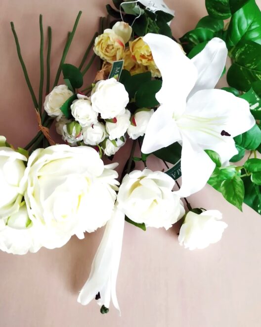 バラの葉、ユーカリ、白菊などです。カサブランカの透き通るような色には、ポラスが合うと思いご用意しましたが、私の確認不足でした。
