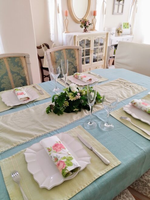 新緑の5月、お部屋の中にもグリーンが欲しい…という生徒さんのお言葉から考えました。アーティフィシャルフラワーのセンターピース。テーブルフラワーとも言いますよね。