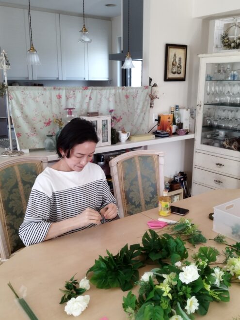 そうです!扱いやすいアーティフィシャルフラワーと言えども、今回は大きな作品です!仕上げにはもっと時間が必要でした。とてもバランスよく作られたと思いましたけれど、ご本人様は、もっとこうしたいという思いがあるように感じられます。
