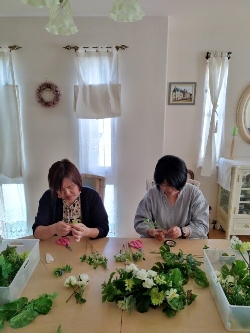 今回も花材はいろいろバリエーションを用意しておりましたが、見本の通りに作りたいとのご希望で珍しくお二人同じ花材でのレッスンとなりました。