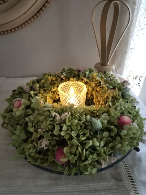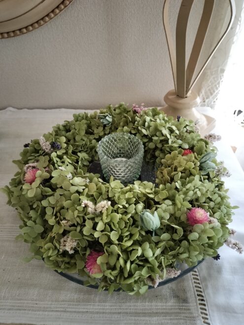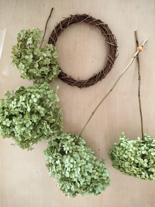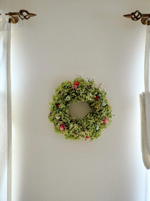 ドライフラワーになったアナベルは、とにかくポロポロ落ちます。これが嫌な方は、生花のうちに作りましょう。生花と言いましても、緑→白→緑と変化するアナベルの最後の緑になってからですよ。生花のうちに作りますと、ほとんど落ちずに作ることが出来ます。
