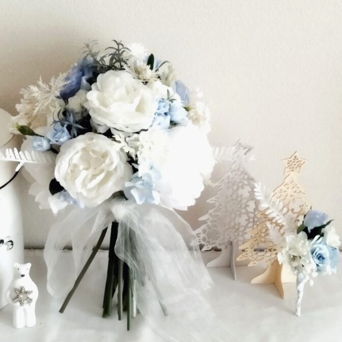 真っ白と水色は大好きな色の組み合わせ。まるで「アナ雪」のような、雪と氷、真っ白な心を思わせるブーケですね。