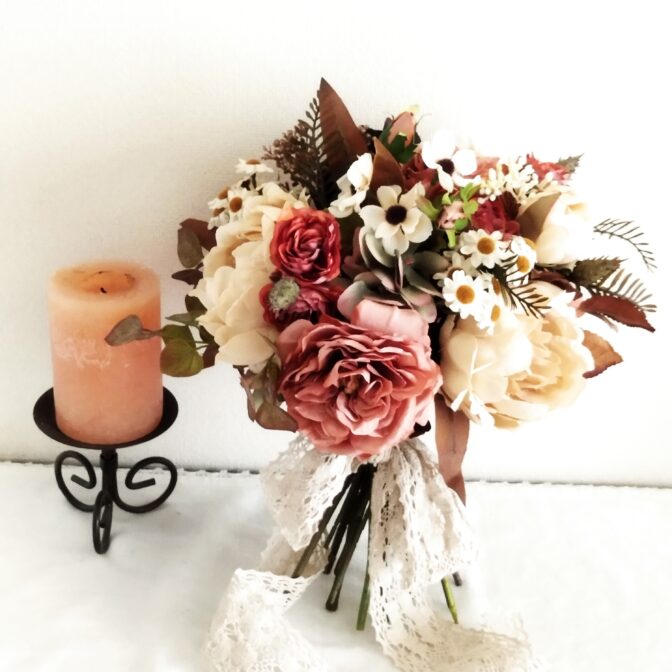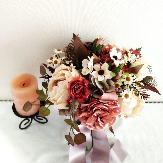 テラコッタカラーのお花でヨーロピアンなブーケを束ねました。ヌーディーカラーと柔らかい印象のアーティフィシャルフラワーブーケです。