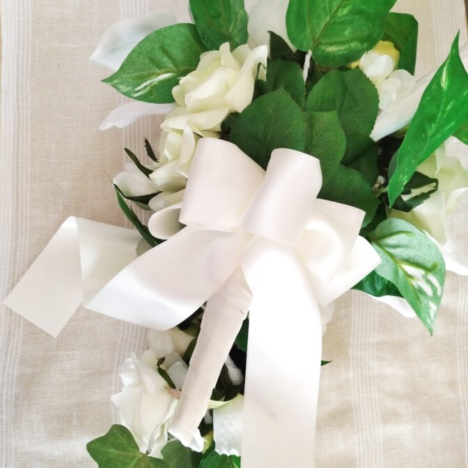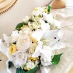 オーダーモニター様からのオーダーです。ウエディングドレスに合わせるキャスケードブーケのオーダーでした。初めは、白いバラと黄色いバラで、とのお話でしたが、式場のカサブランカが印象的です…と伺い、カサブランカ足せますよ、となりました。花嫁様が、お式をとても大切なものとお考えなのが伝わってきます。黄色のバラを具体的にどんなバラにするか、またリボンをお決めになる際も、選ばれます時に「こちらの方が優しい感じがしますから。」というお言葉を何度もありました。
