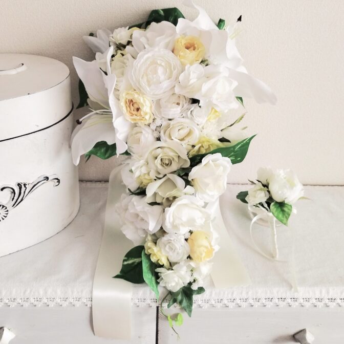 ホワイトローズとカサブランカのキャスケードブーケ