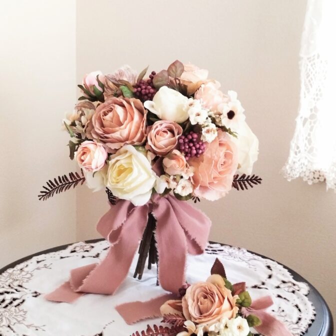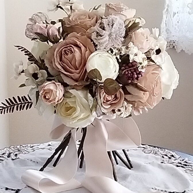 アンティーク加工されたアーティフィシャルフラワーのショコラブーケをメインに、ヌードからの柔らかい色合い、チョコ色の葉を入れて束ねました。